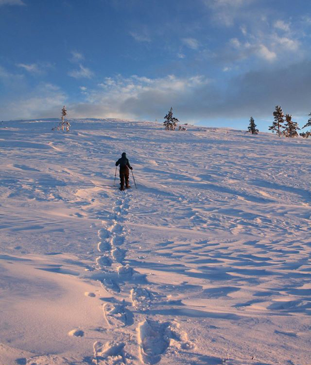 Quickly, snow comes to the open fells, lakes freeze over and days grow shorter. In the beginning of December the sun disappears and makes way for ‘Kaamos’, the polar night. Since it is dark most of the time, it is easy to observe the Northern lights brightening the sky and hues of sunrise and sunset colour the landscape around midday. Though this is a difficult time of year to spend days outdoors (short ‘daylight hours and low temperatures down to -40) it is also a stunning one. You can still go out for short snowshoe walks on the fells as long as you are well kitted out against the cold and darkness, though the moon can often provide quite a lot of light as well! It is important to note the Finninsh climate feels much more continental (dry, cold and stable) than it’s neighbouring Norway.
